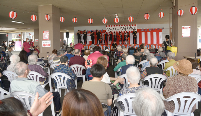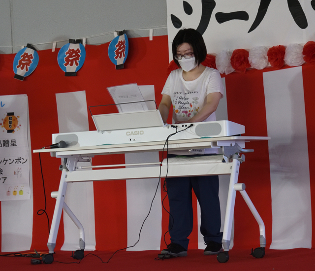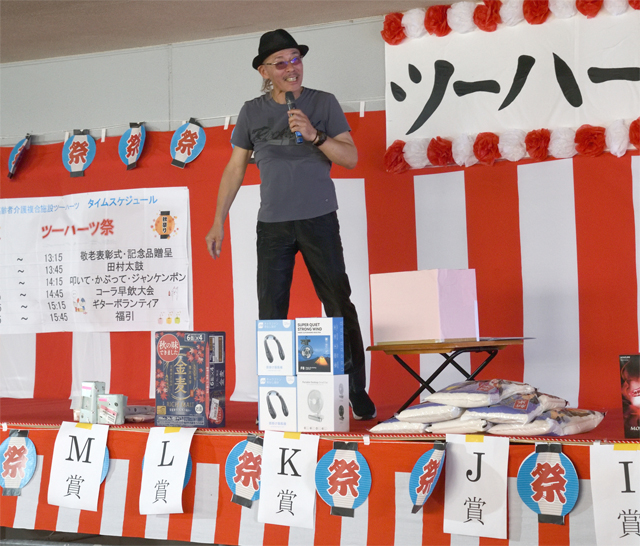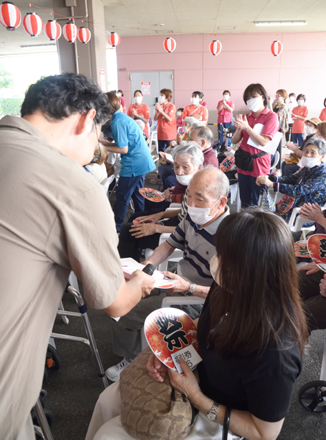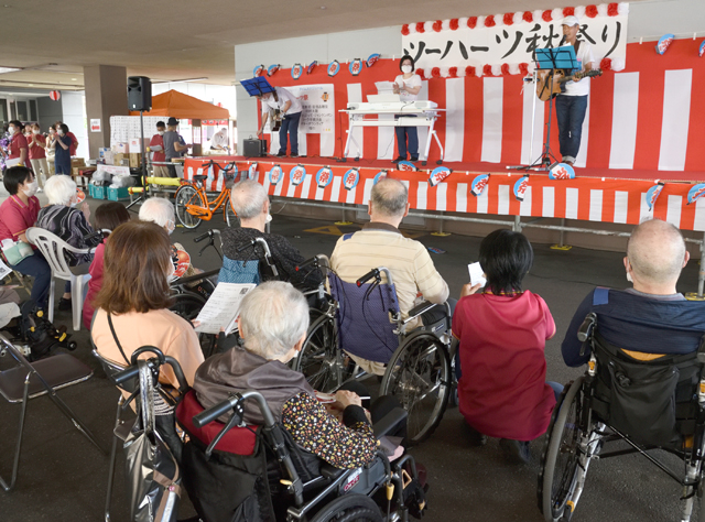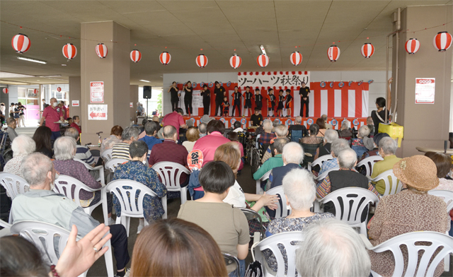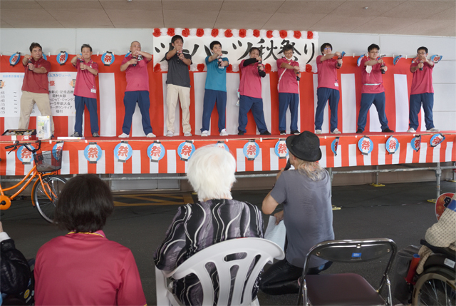 入所者様のコーラス隊による歌のプレゼントでは衣装を揃えて、指揮者もパリッとスーツ姿で登場。会場の皆さんと共に歌いました。